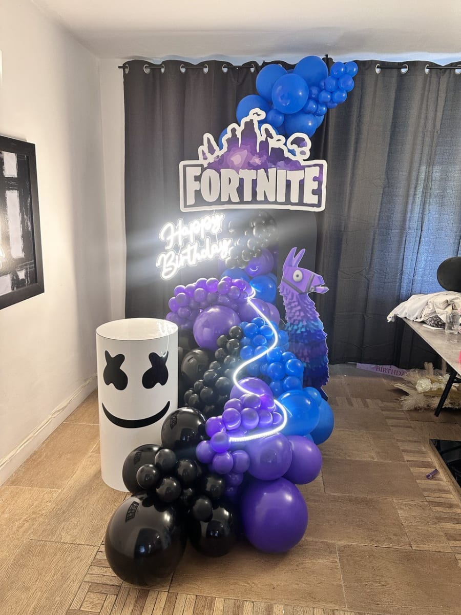 Our Fortnite Balloon Display is designed to make your party stand out. With a combination of vibrant colors and Fortnite-themed balloons, this display will create a festive atmosphere that will delight both kids and adults. The display includes a variety of balloons, including a balloon garland, cut outs and led lights which can be customized to match your party's color scheme.