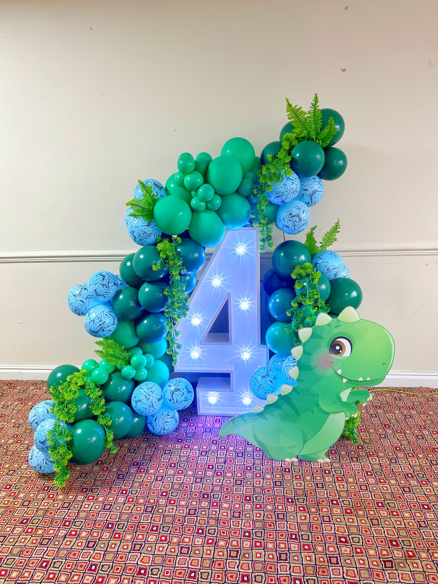 Transform your party into a dino paradise with our balloons, led number, dinosaur balloons in Birmingham, Coventry, Solihull, Sutton Coldfield, Walsall, Redditch, Bromsgrove. Book your Dinosaur Number Display today and make your event an unforgettable adventure!