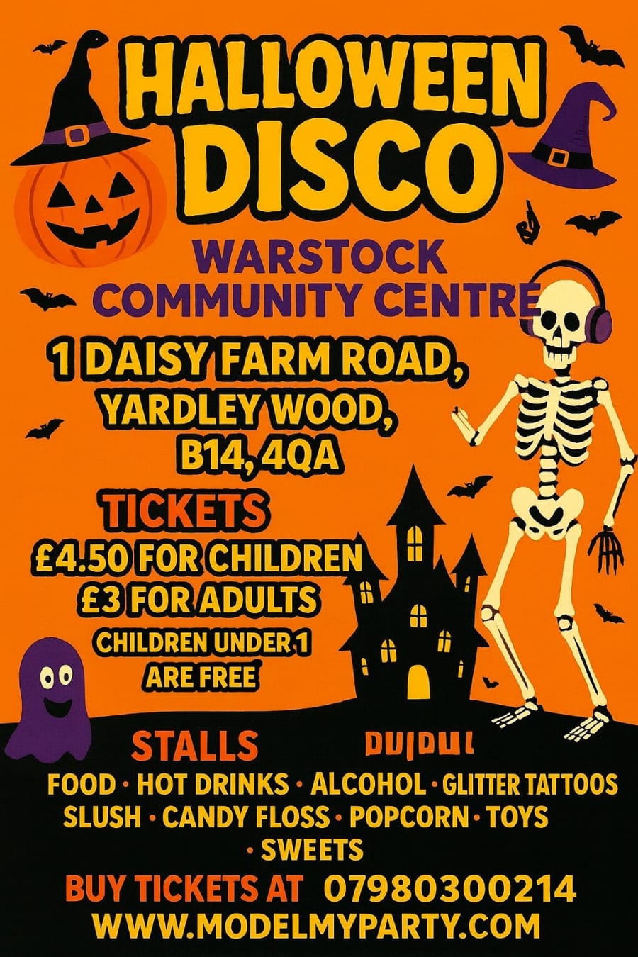 Join us for a spooktacular evening at the Halloween Disco at Warstock Community Centre, Birmingham. Each child must be accompanied by an adult, so grab your ticket and enjoy a night filled with music, dancing, stalls, and plenty of family fun.