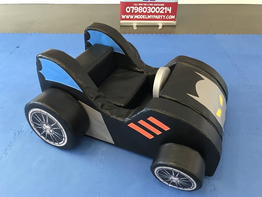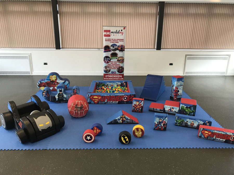 Superhero Ball Pit, 1 Spiderman Ball, 1 Batmobile, 1 Foam Slide, 4 Stepping Stones, 1 Batman Double Rocker, 3 Spiderman Blocks, 1 Ironman Rocker, Hulk Big Block, Superman Block, 2 Foam Banners, 6 Triangle Slices (Ironman, Captain America & Wolverine)