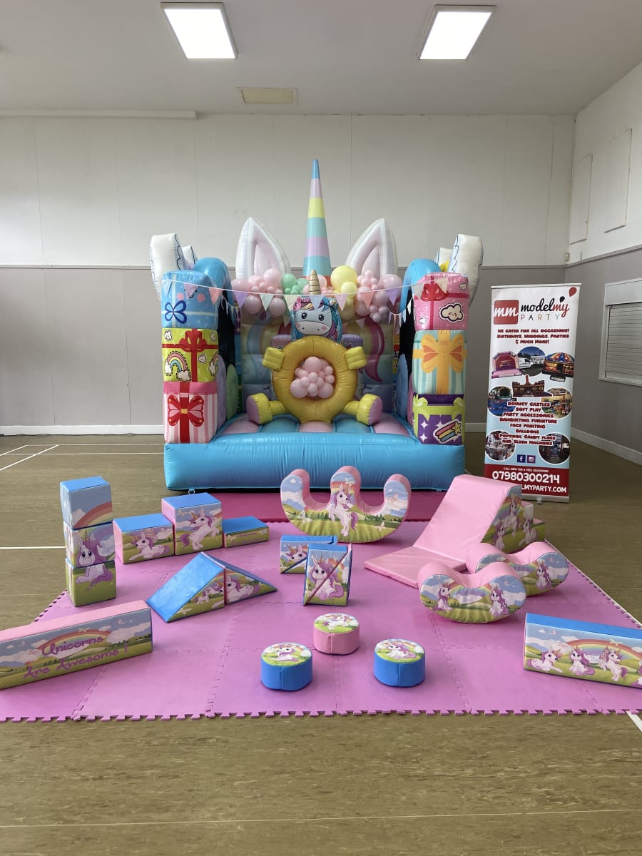 Unicorn Pastel Bouncy castle with matching soft play! This beautiful set will fit in most venues aslong as the ceiling it tall to fit in the horn at the rear of the castle. The pastel colours go well with matching balloons and a cake table display (that we can also provide). This package will take around 30 minutes to set up once we arrive.